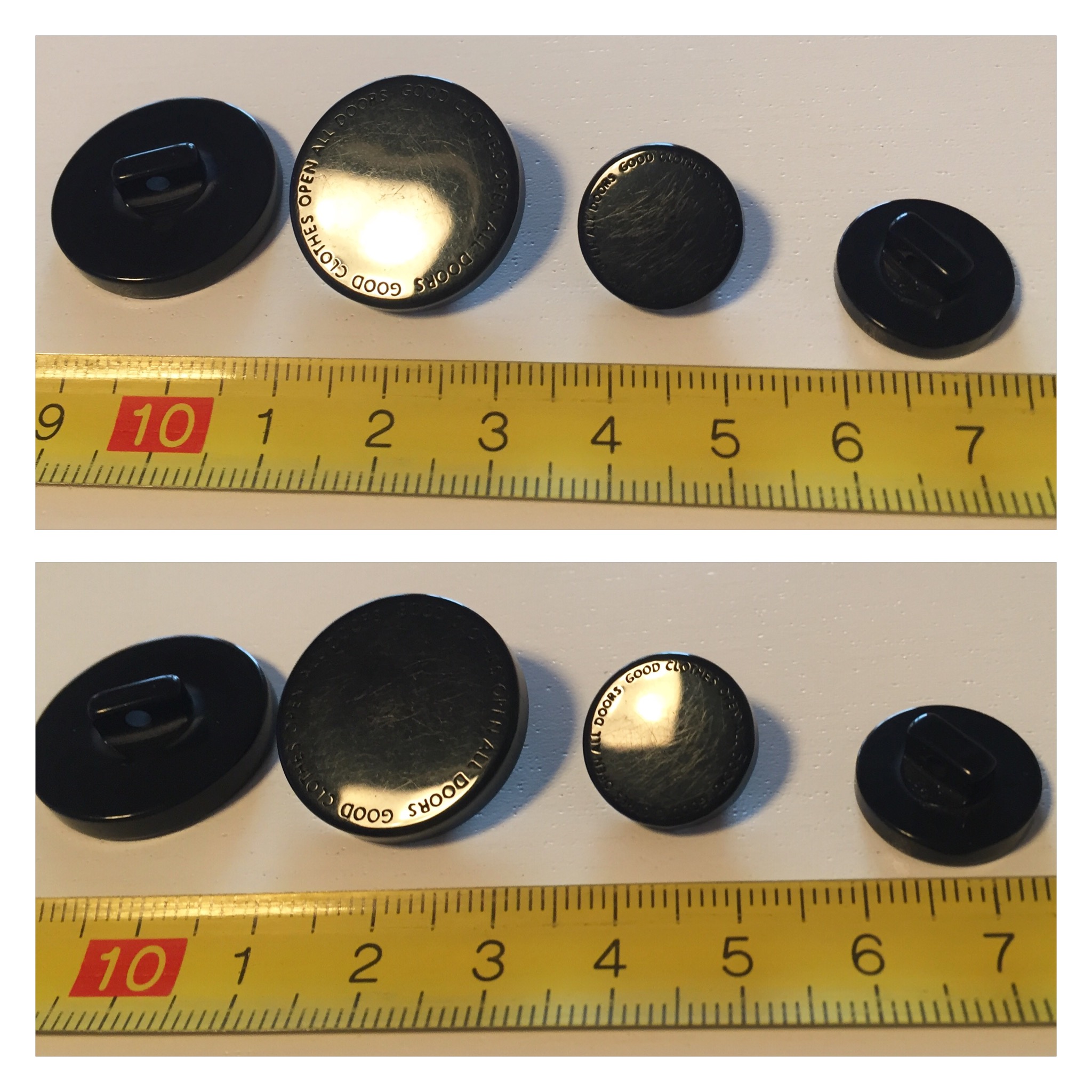 Надпись на пуговице: "Good clothers open all doors", перевод - "Хорошая одежда открывает все двери"